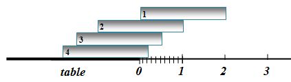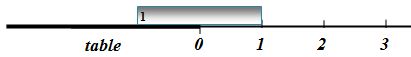 Now we will shift the block until the center of gravity is at zero so that it still barely stays on the table. Since the block has width 2 and center of gravity -1 we can shift it half its width (1 unit) to the right and it will still remain on the table.