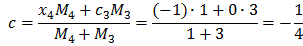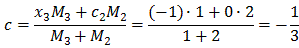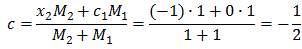 Now Jillian remembers her math background and attacks the problem analytically. Recall that the combined center of gravity c of two objects with (point) mass M1 and M2, located at x1 and x1, respectively, is: