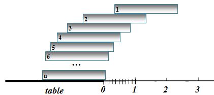 - Lift up the existing stack Sn with n blocks, center of gravity 0, and overhang Dn = 1+1/2+...+1/n